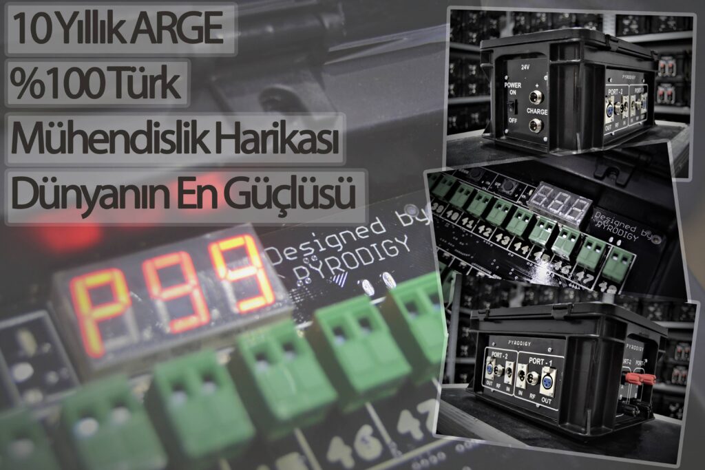 10 yıllık ARGE, %100 Türk Mühendislik Harikası. Dünyanın en güçlü, en hızlı ve en güvenli bilgisayar destekli Pyromüzikal Show Kontrol sistemini ürettik. Sistem; Artnet, E1.31, CANBus, DMX, GFSK Modülasyon Kablosuz Haberleşme arayüzleri bir arada taşıma özelliğine sahip Dünyanın ilk Sistemidir. Ayrıca Dünyada ilk defa 3 farklı Kablosuz bant üzerinden haberleşen tek cihazdır.
